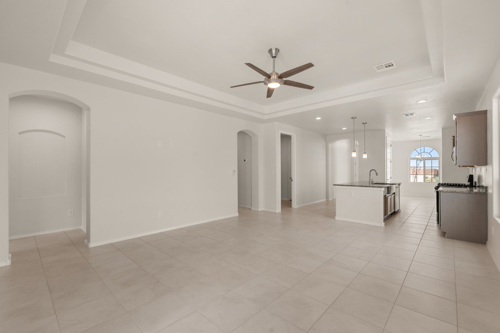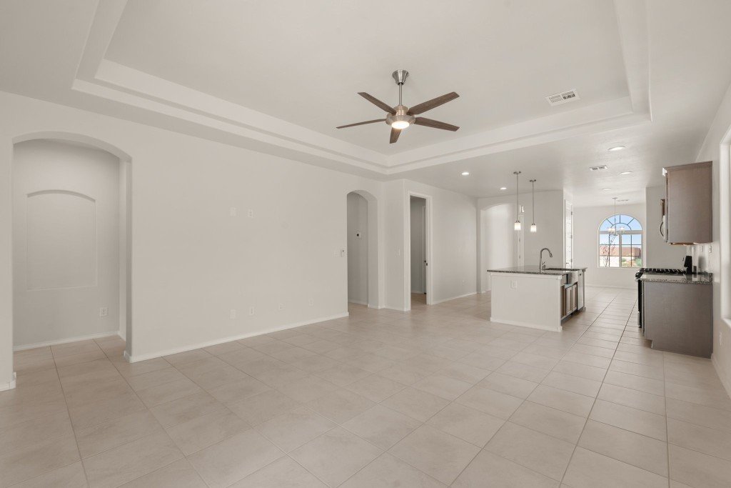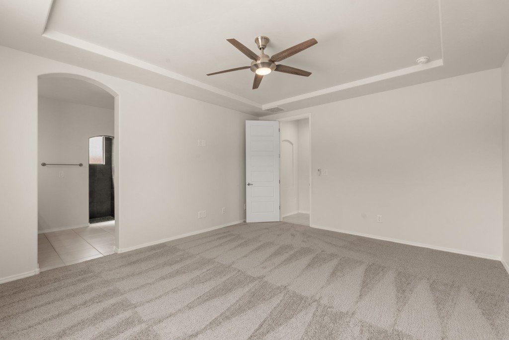 - Interior design includes elegant tray ceilings and hand-textured walls throughout