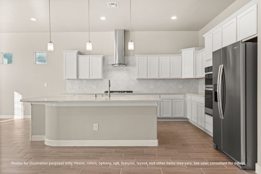 - Modern kitchen with large pantry, ample counter space, and central island is perfect for entertaining