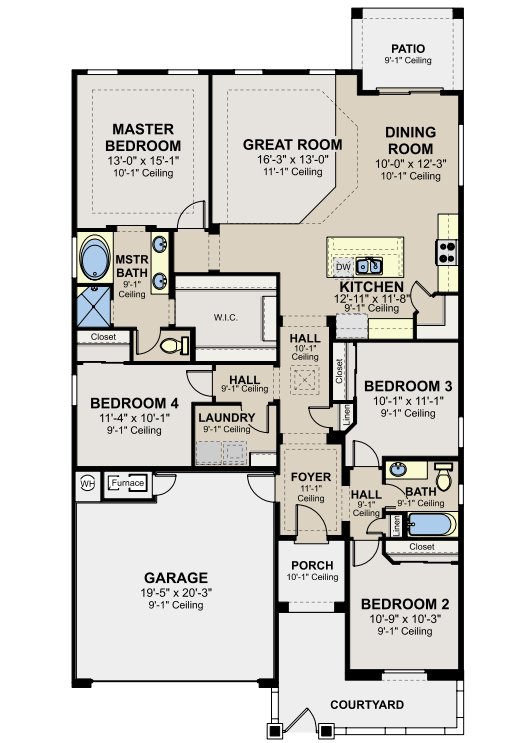 You’ll love the expansive, open-concept atmosphere of this popular 4 bedroom, single-story home. The family-inspired design provides the ideal combination of spacious gathering areas and relaxing retreats. Bedrooms are thoughtfully placed in separate areas of the house for privacy and comfort.