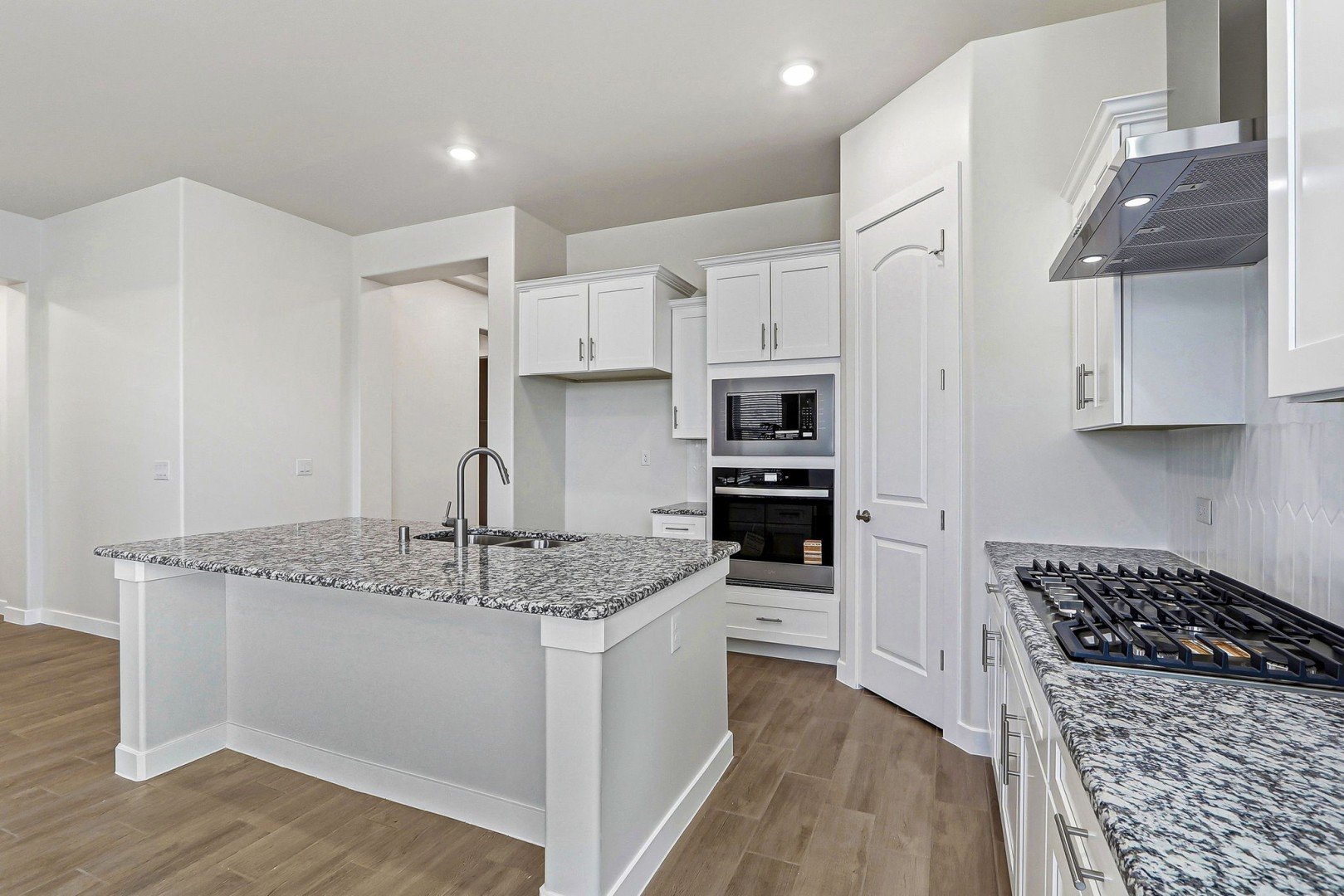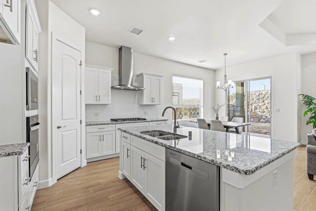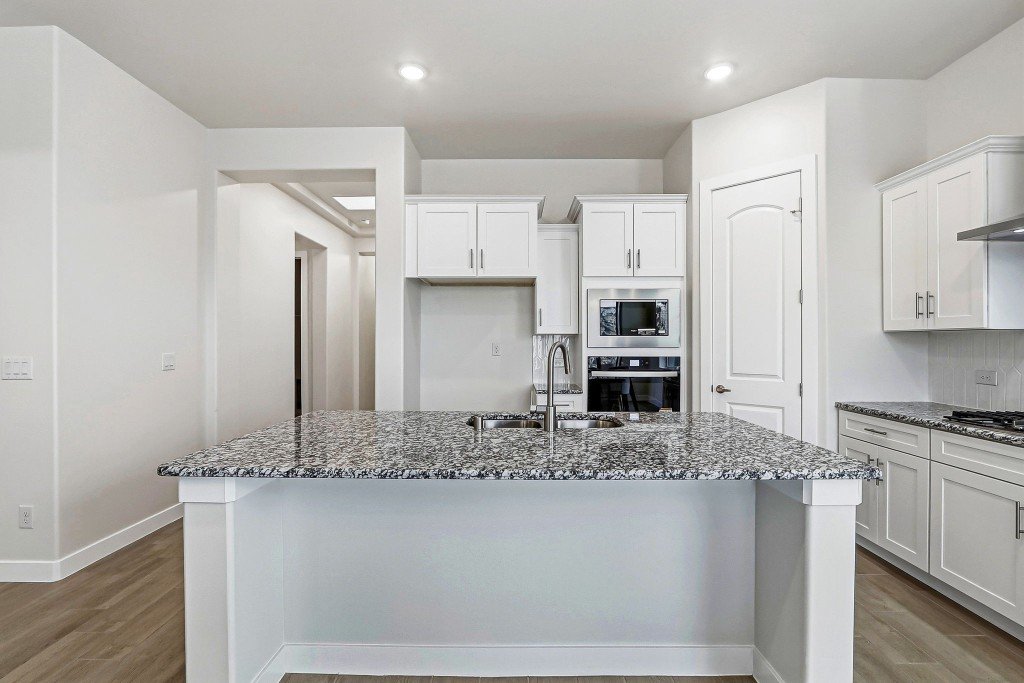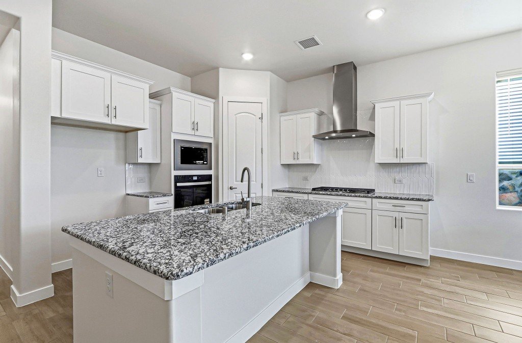 - Modern kitchen features a large island and corner pantry for ample storage