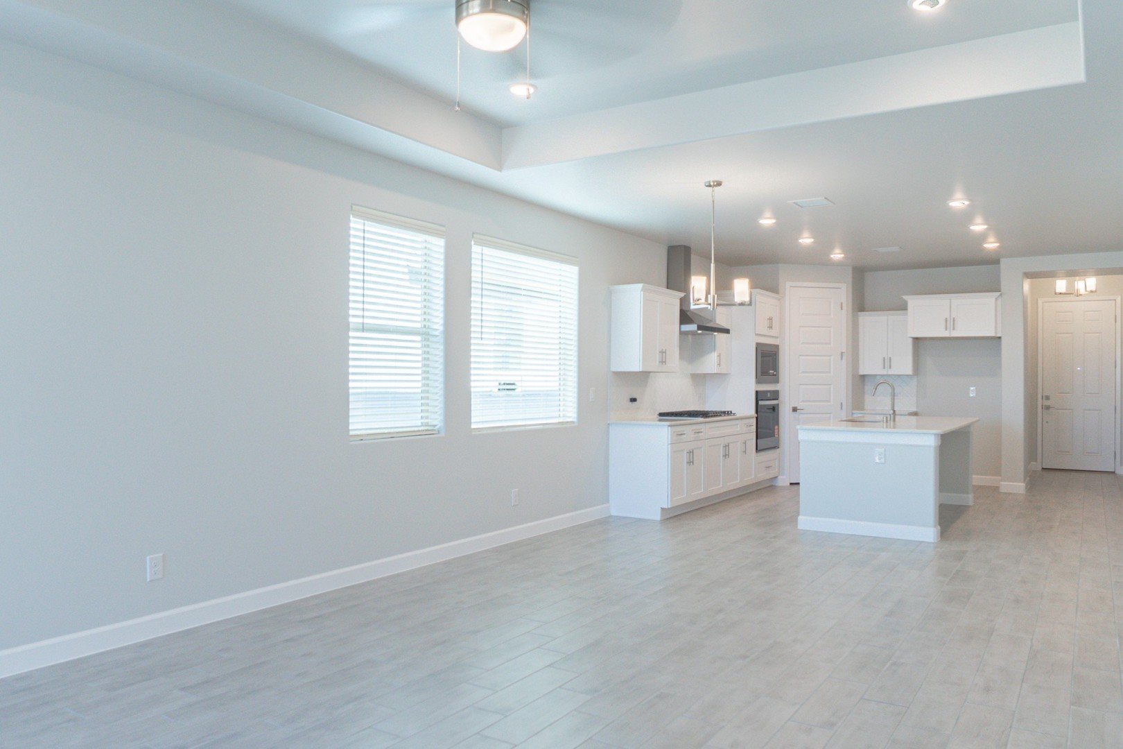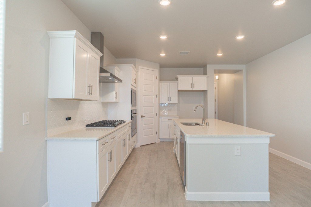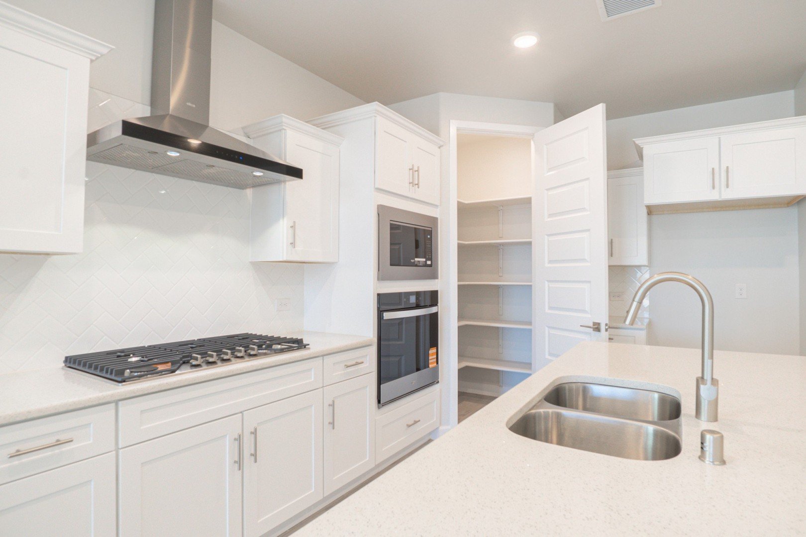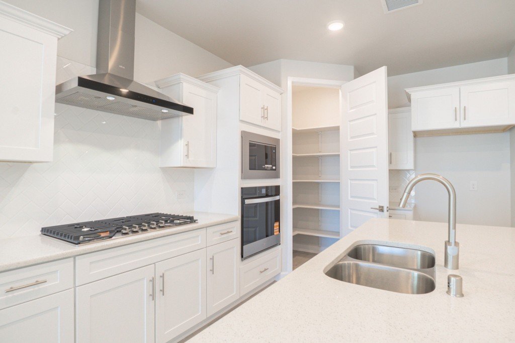 - Spacious island and corner pantry add style and function to the bright kitchen area