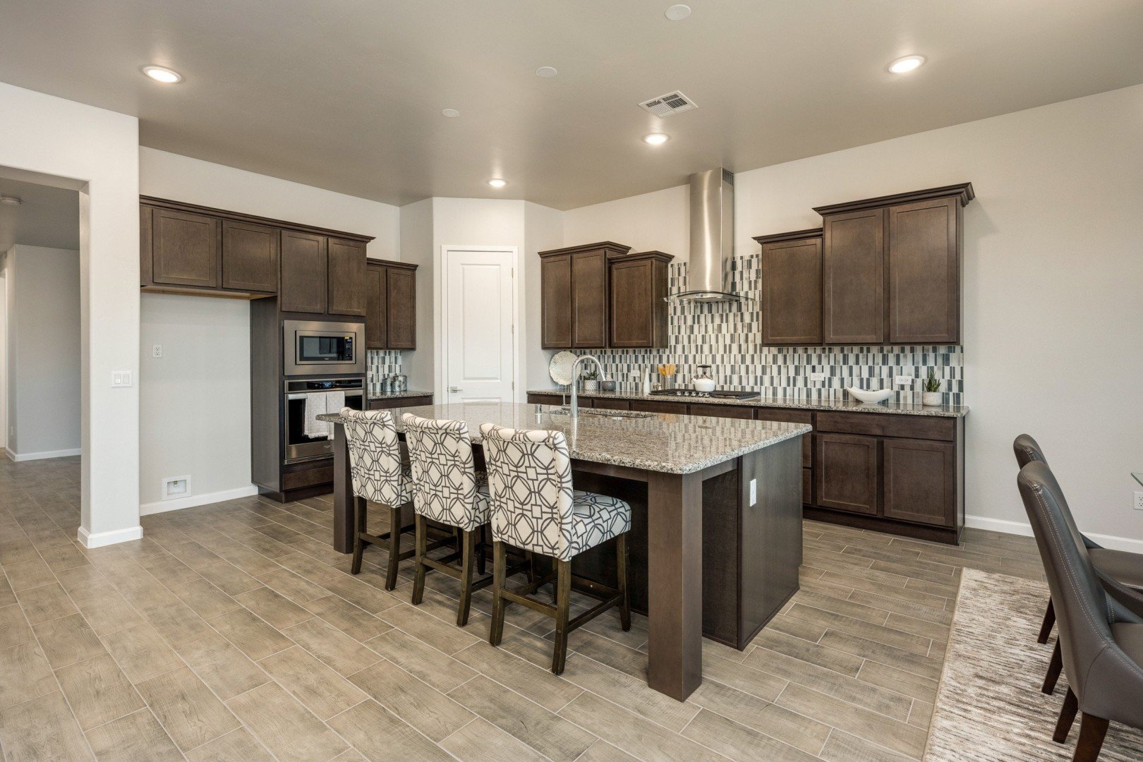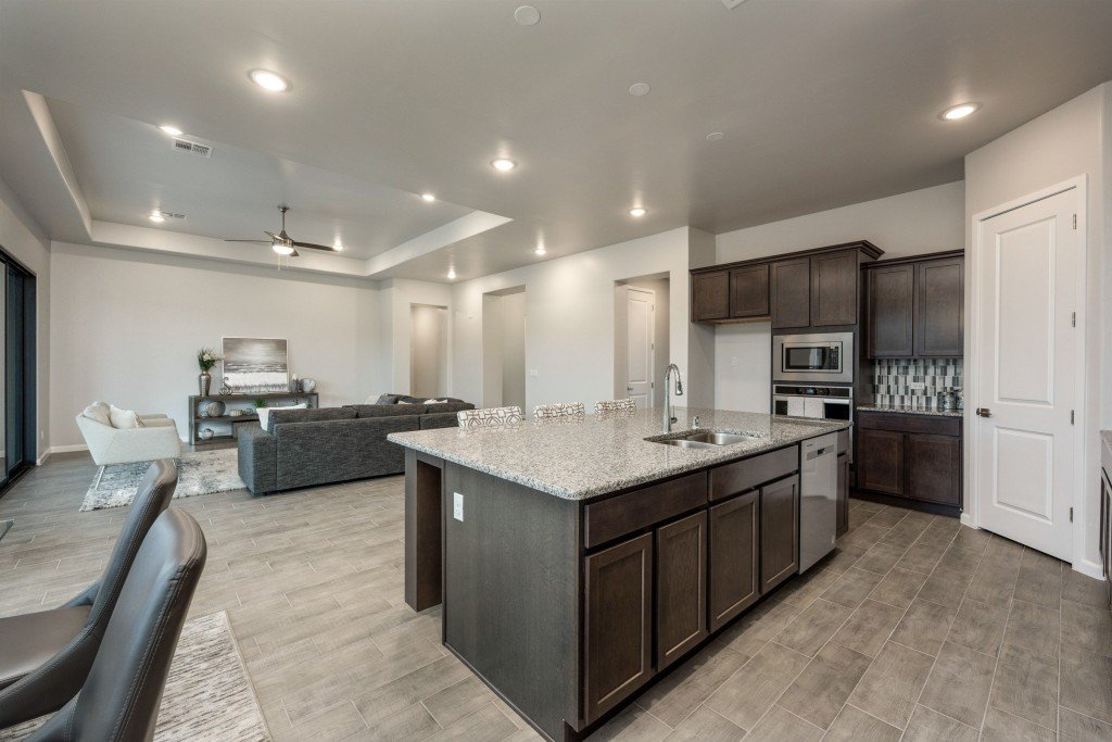 This home features a grand living area and luxurious owner suite. The open floor plan encompasses three spacious bedrooms as well as a flex room or optional 4th bedroom with ample space for study, sleep, and storage. The gourmet kitchen flows through to the dining area, opening into the expansive great room and charming rear patio.