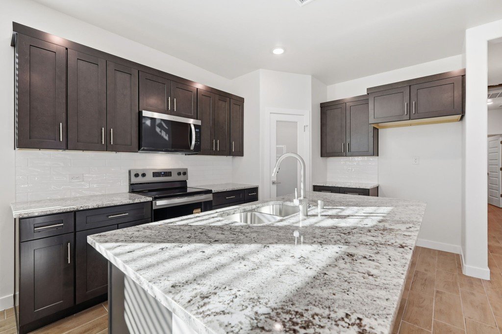 Step into the Big Bend, a thoughtfully crafted floor plan that makes the most of its space. With up to 4 bedrooms, 2 full bathrooms, and 2 garage spaces; there is room for an expanding family to grow. Enter the home and step into the open-concept main living area consisting of a spacious Great Room, a dining area, and a gorgeous kitchen complete with a sleek cooktop and stainless steel vent hood, a large island for prepping, and a corner pantry to maximize space. Tucked towards the back of the home, the master suite offers maximum privacy and features a luxurious ensuite with double vanities, a separate water closet, a step-in shower, a large walk-in closet. Two secondary bedrooms and their shared full bathroom are privately located down the hall, offering comfort and seclusion for family members or guests. Near the entrance, the study can be converted into a fourth bedroom. Additional highlights of the Big Bend include a two-car garage with extra storage space and a covered backyard patio, perfect for enjoying quiet mornings or lively evenings.