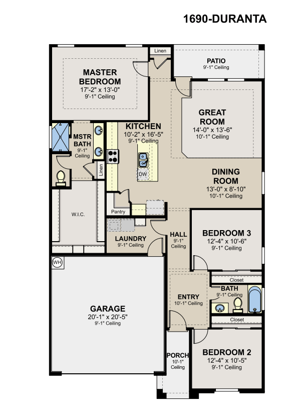 Discover the perfect blend of comfort and style with the Duranta, a thoughtfully designed single-story floor plan that combines modern elegance with practical living spaces. From the inviting front porch, step into a spacious open-concept layout where the kitchen, dining area, and great room flow effortlessly together, creating a bright and welcoming environment ideal for both daily living and entertaining. The kitchen is equipped with sleek countertops, a large island for meal preparation and casual dining, and a walk-in corner pantry offering plenty of storage. The dining area is conveniently situated for both intimate meals and larger gatherings, while the great room is filled with natural light, providing a cozy and inviting atmosphere. The primary bedroom, located at the rear of the home for added privacy, serves as a peaceful retreat, complete with a spa-inspired ensuite featuring dual vanities, a walk-in shower, and a generously sized walk-in closet. Two additional bedrooms, located at the front of the home, provide privacy and are ideally located near a shared full bathroom. Additional features of the Duranta include a centrally located laundry room and a two-car garage with plenty of storage space to meet your needs.