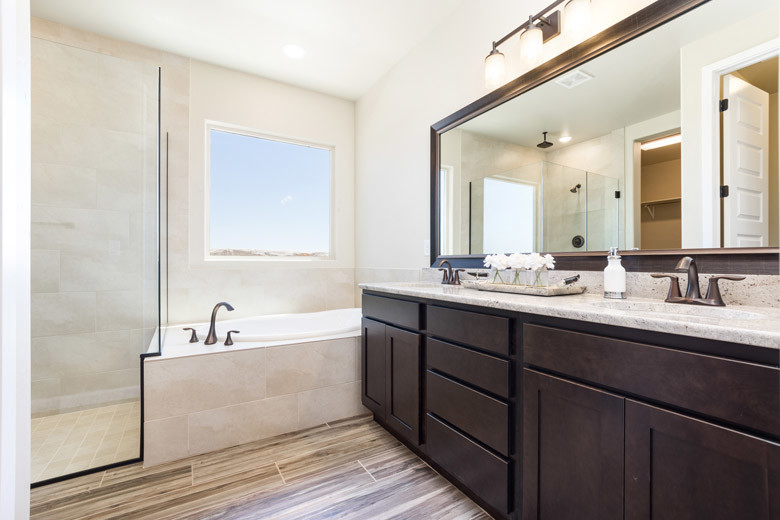 - Beautiful owner suite includes a dual vanity, soaking tub, separate shower, private toilet room, and large walk-in closet