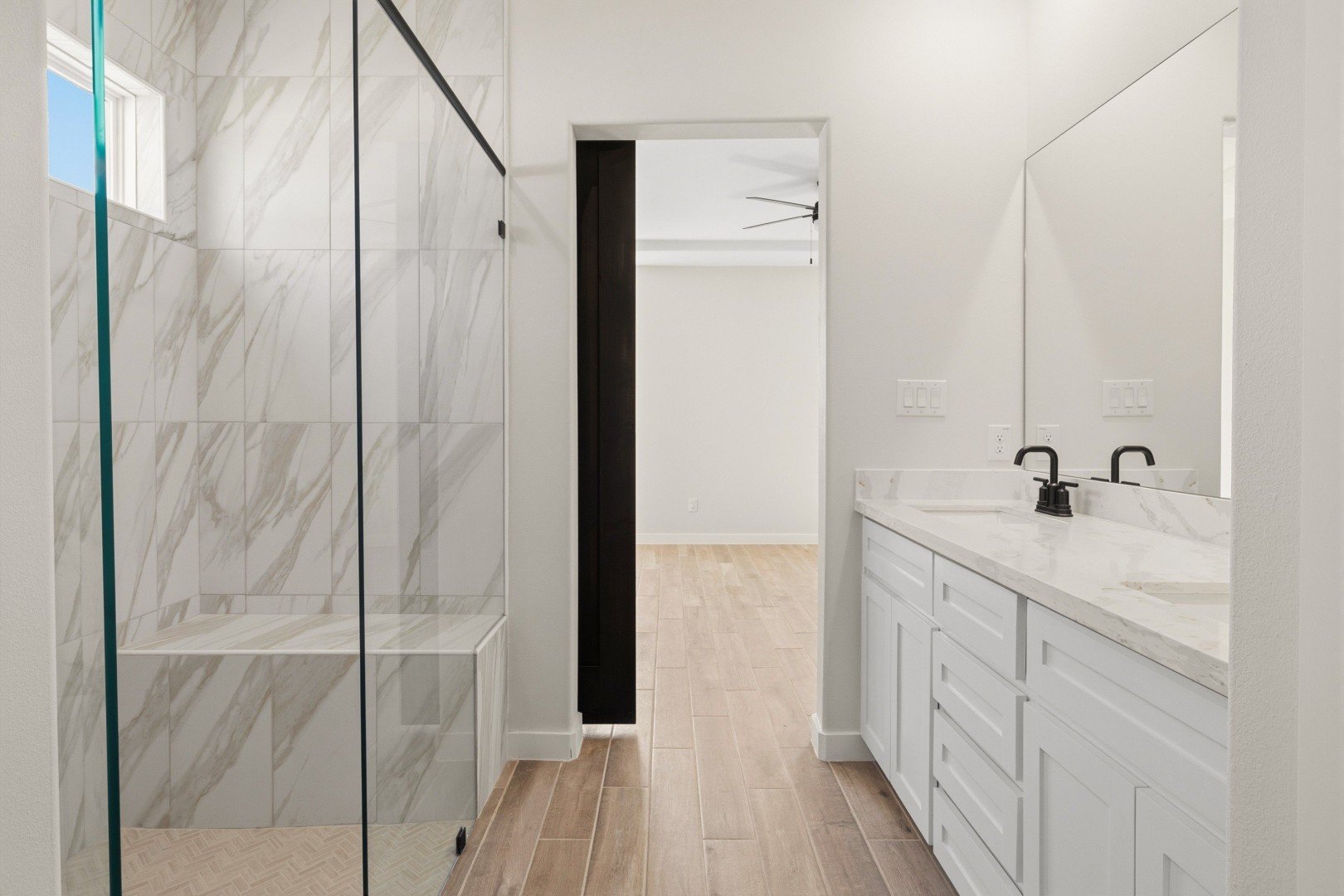 - A luxurious master suite featuring a deluxe glass shower or tub with glass shower options