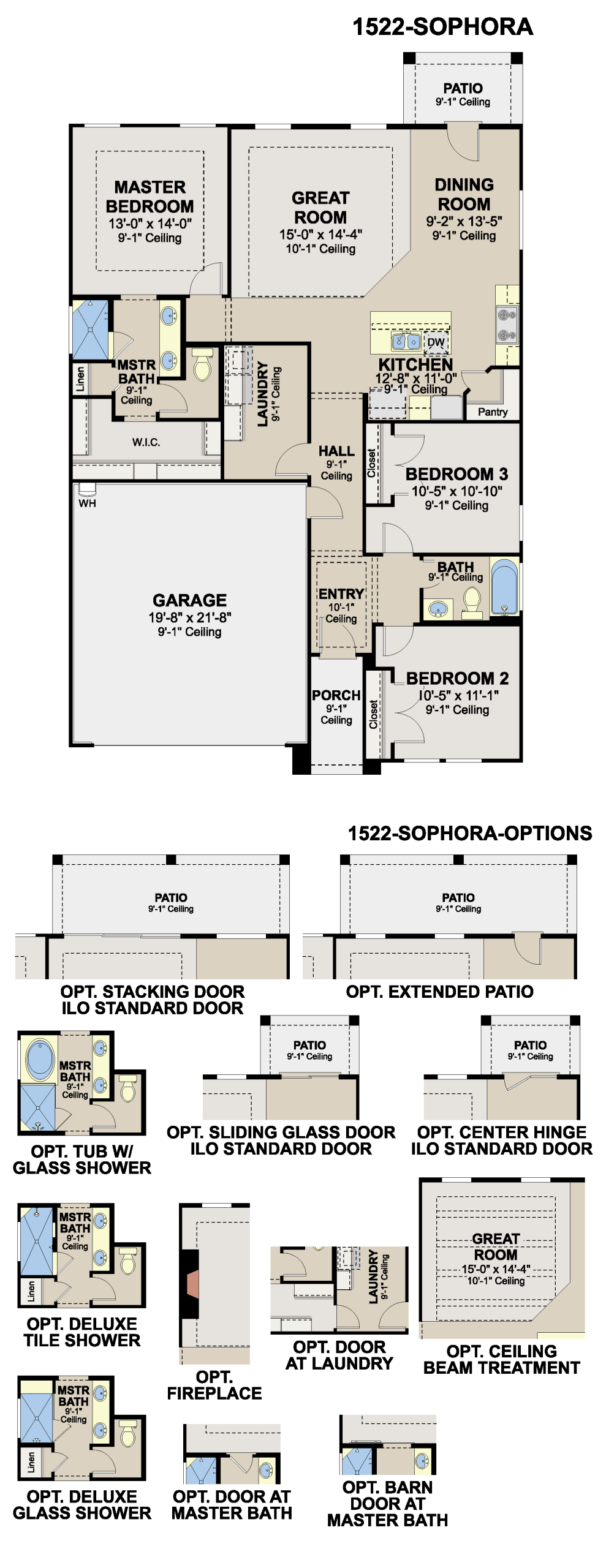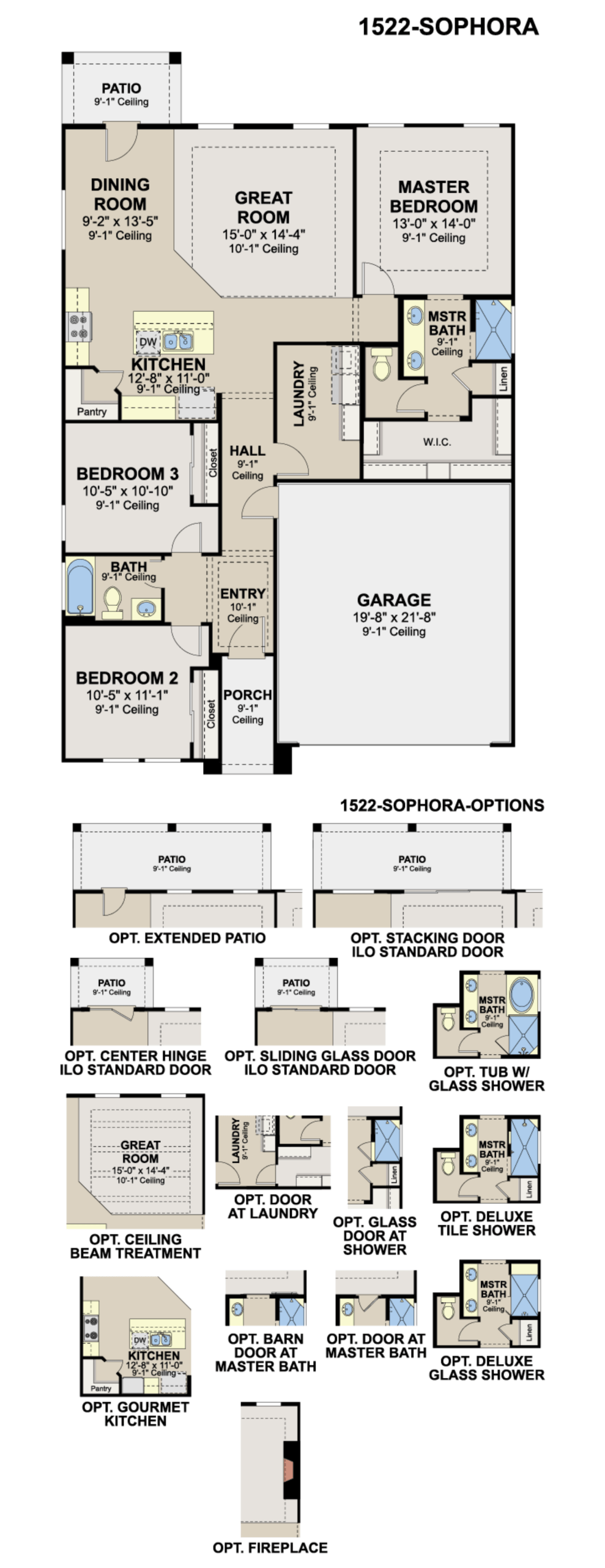 - Upgraded options available including ceiling beams, barn door, fireplace, or extended covered patio