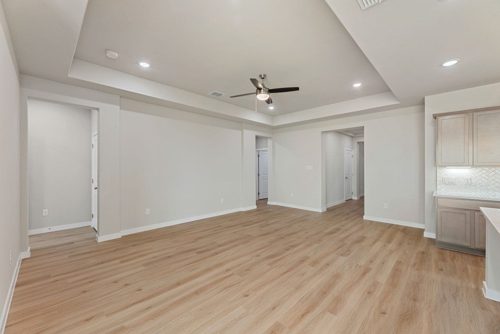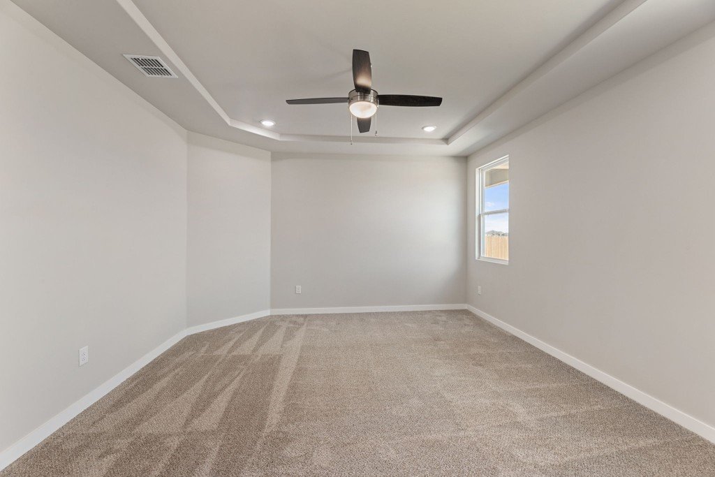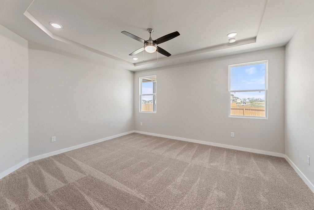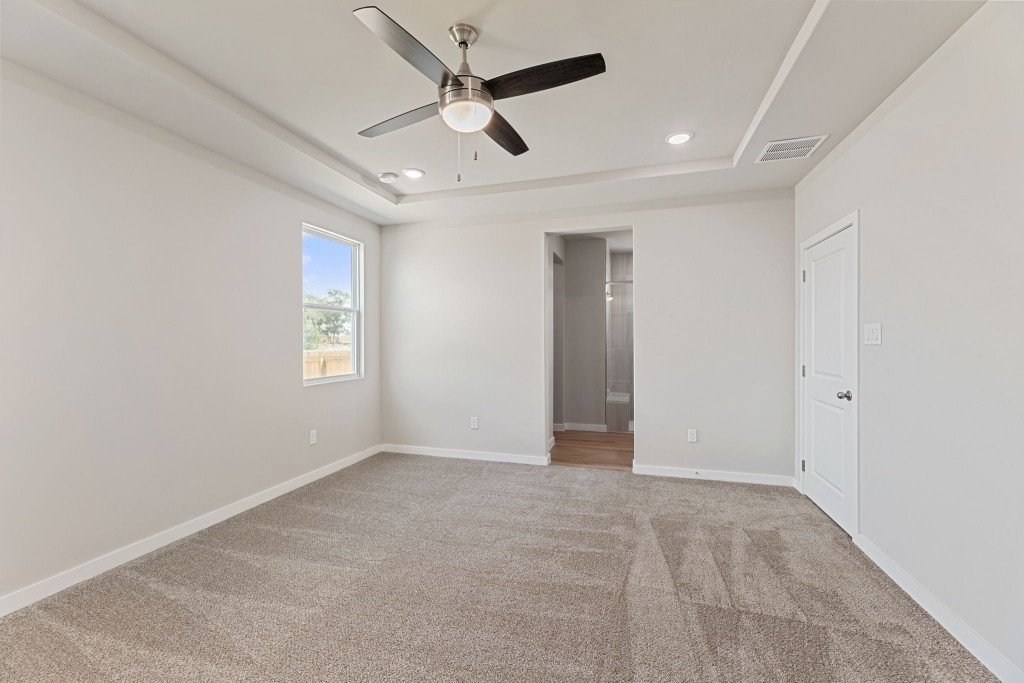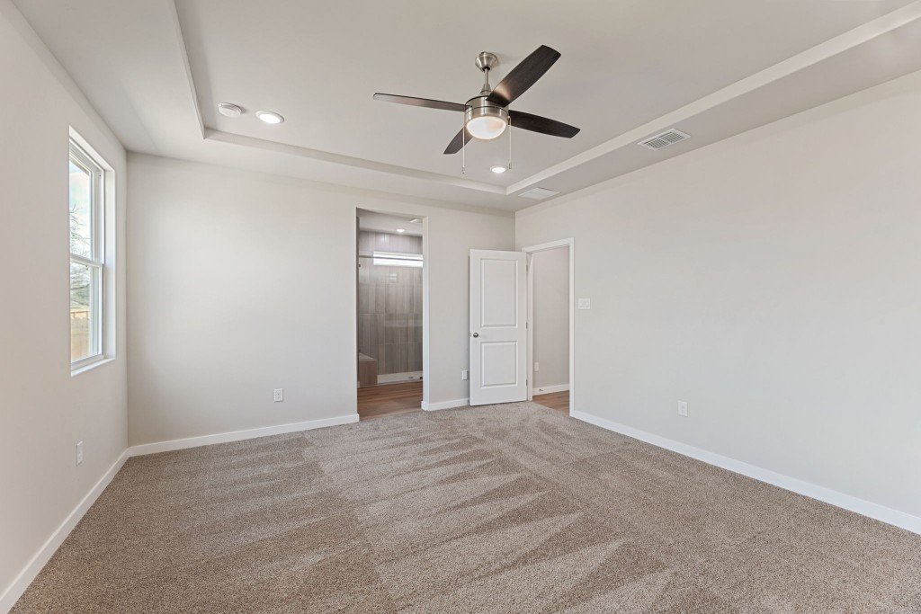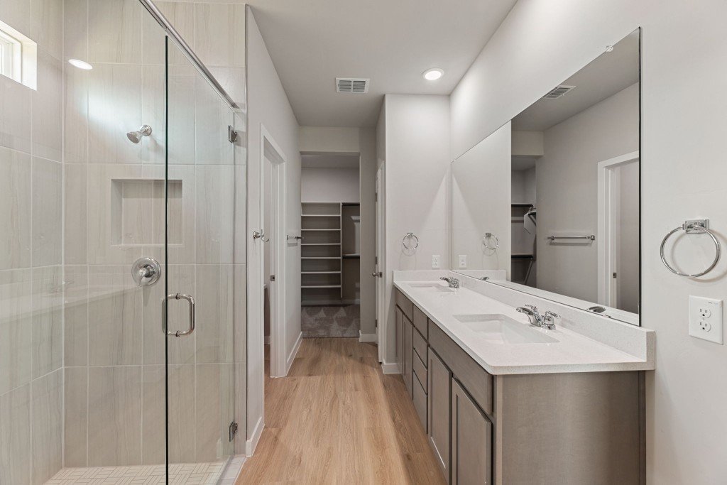 The private owner’s suite includes dual vanities, a glass-enclosed shower, and two walk-in closets, while secondary bedrooms are thoughtfully separated for added comfort.
