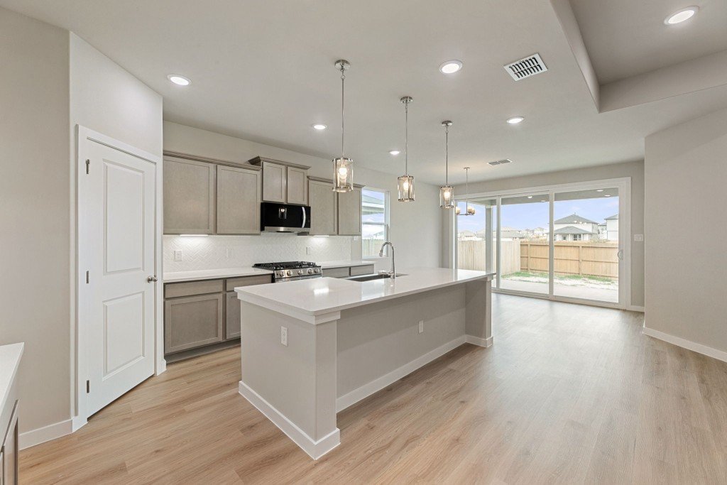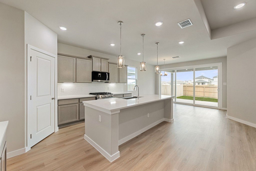 Inside, the open-concept design features luxury vinyl plank flooring, a gourmet kitchen with quartz countertops, stainless steel appliances, and a farmhouse sink. A 3-panel stacking glass door opens to a covered patio, perfect for relaxing or entertaining outdoors.