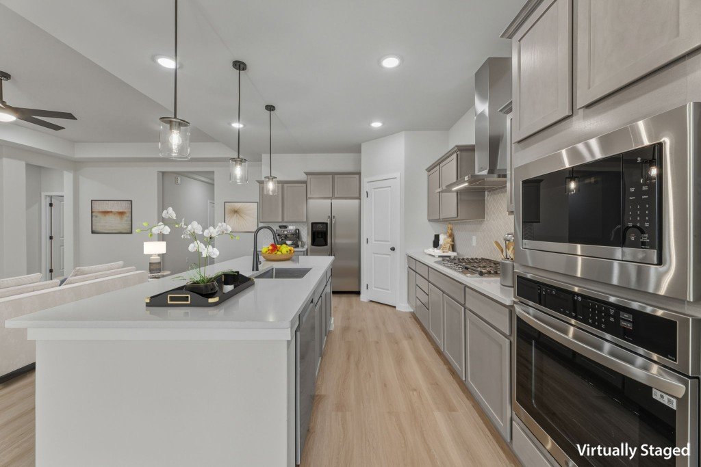 Further inside, the home opens into a bright, open-concept living area. The great room connects seamlessly to the kitchen, which features sleek countertops, a large island, abundant cabinetry, and a corner pantry for extra storage. The adjoining dining area provides a warm space for everyday meals and gatherings.