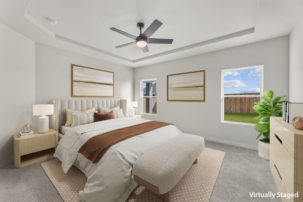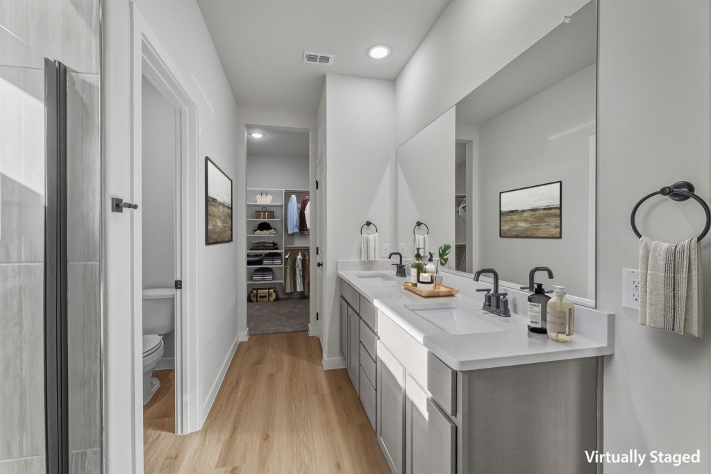 A third secondary bedroom and nearby powder room add convenience and versatility—perfect for guests, multigenerational living, or a home office. Tucked at the back of the home, the private owner’s suite includes a spa-inspired bath with dual vanities, walk-in shower, and two spacious walk-in closets.