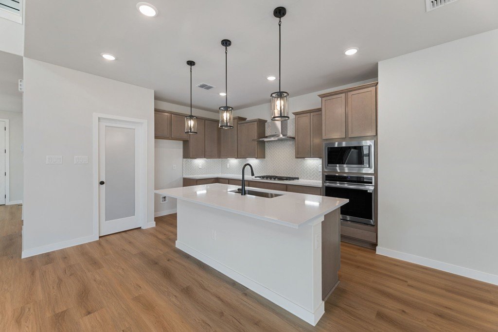 The kitchen features a large center island, sleek countertops, and abundant cabinetry for effortless organization. The private owner’s suite on the first floor includes a spa-inspired bath with dual sinks, a walk-in shower, and a generous walk-in closet.