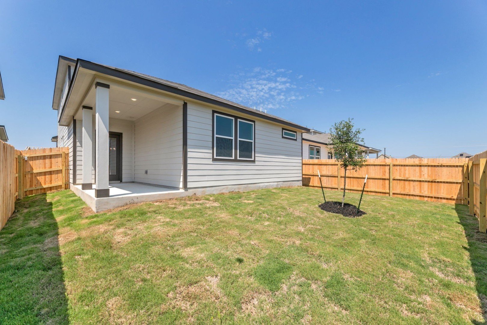 - A covered patio and sliding glass backdoor easily take the festivities outdoors