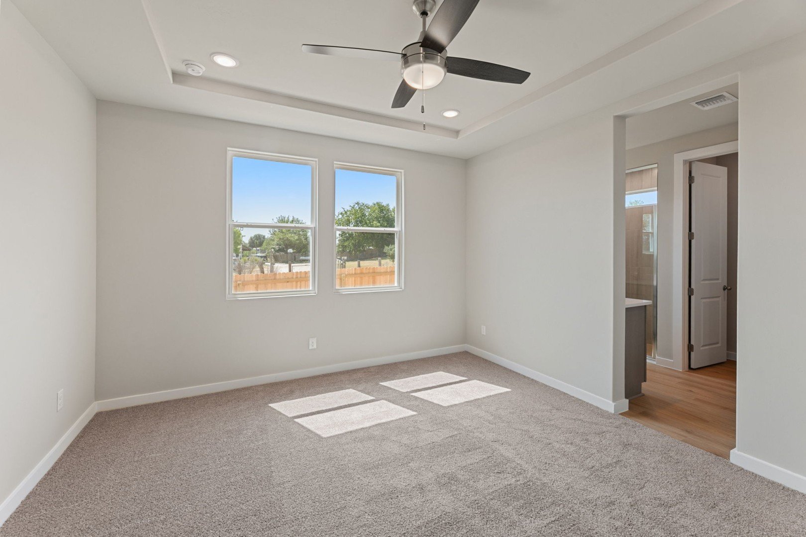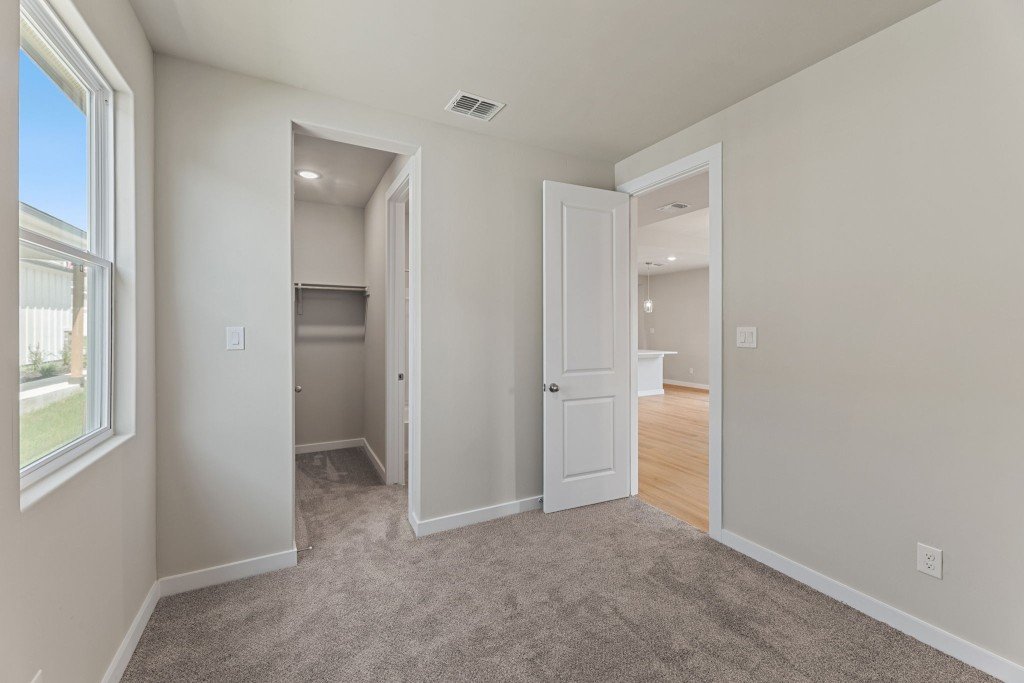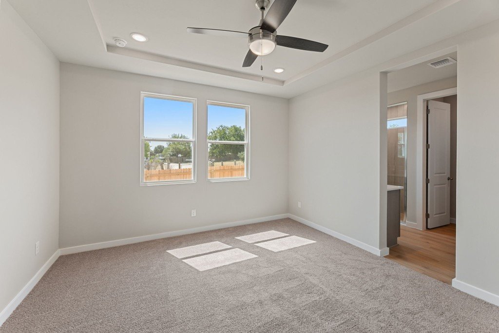 The private owner’s suite includes a tray ceiling, dual vanities, an oversized walk-in shower with tile and glass enclosure, and a spacious walk-in closet. Three additional bedrooms are smartly placed for privacy, including one near the main living area-ideal for a nursery or guest room with its own bath.
