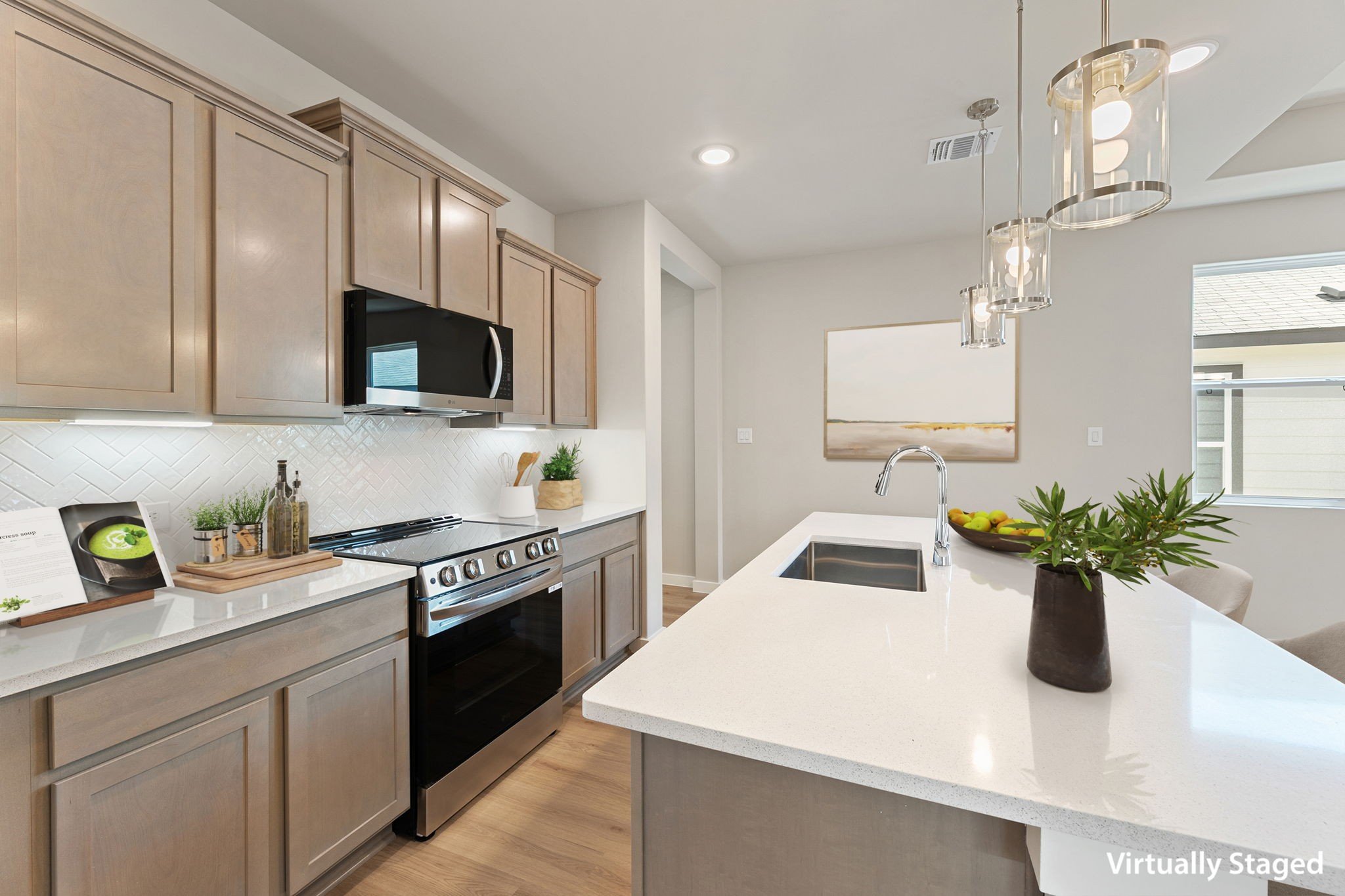 Step inside to an inviting open-concept living area with luxury vinyl plank flooring, 10-ft coffered ceilings, and 8-ft interior doors for a bright, upscale feel. The kitchen features white quartz countertops, gray-stained cabinets, a herringbone backsplash, pendant lighting, and a large island with a single-bowl sink-perfect for cooking, entertaining, and gathering with loved ones.