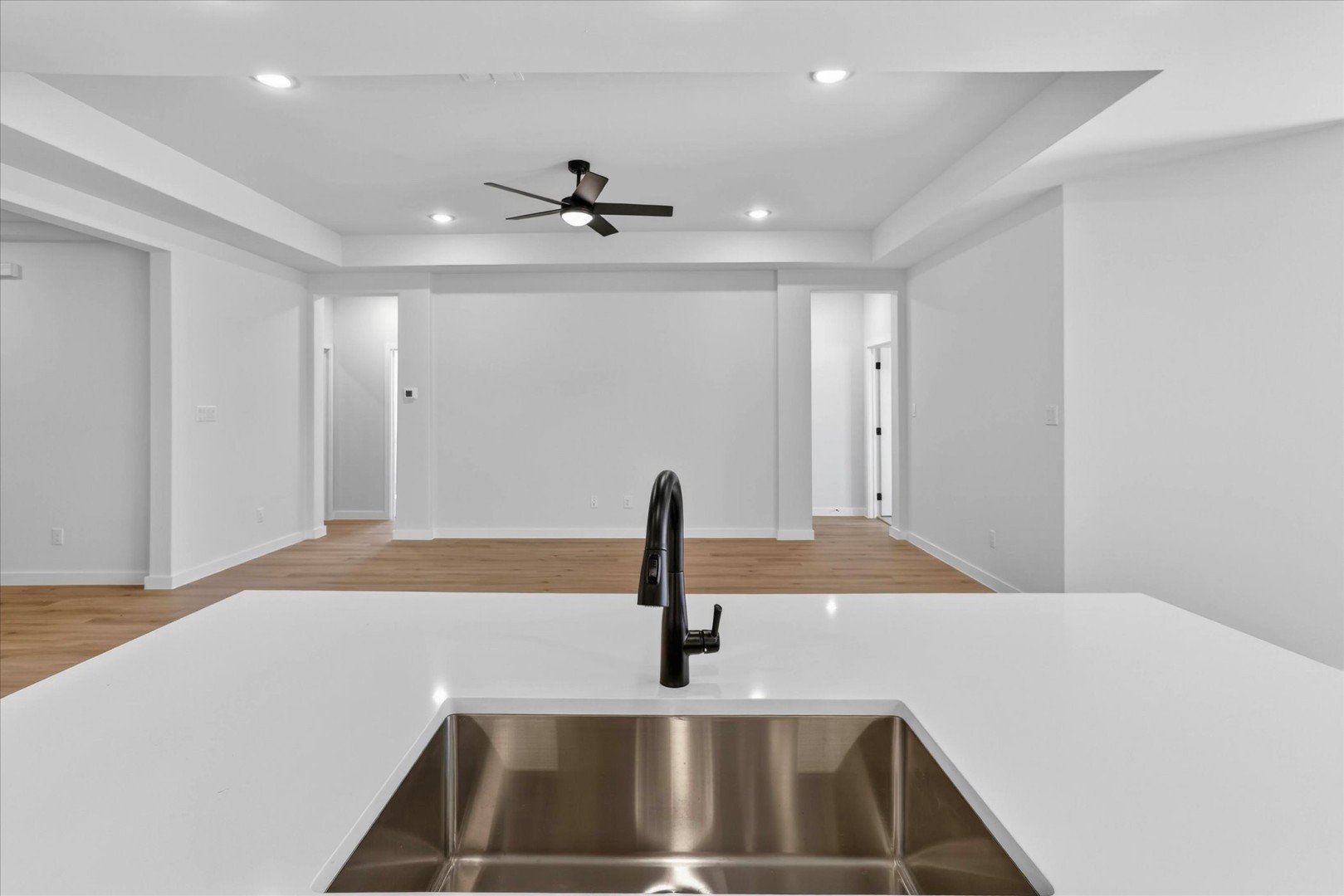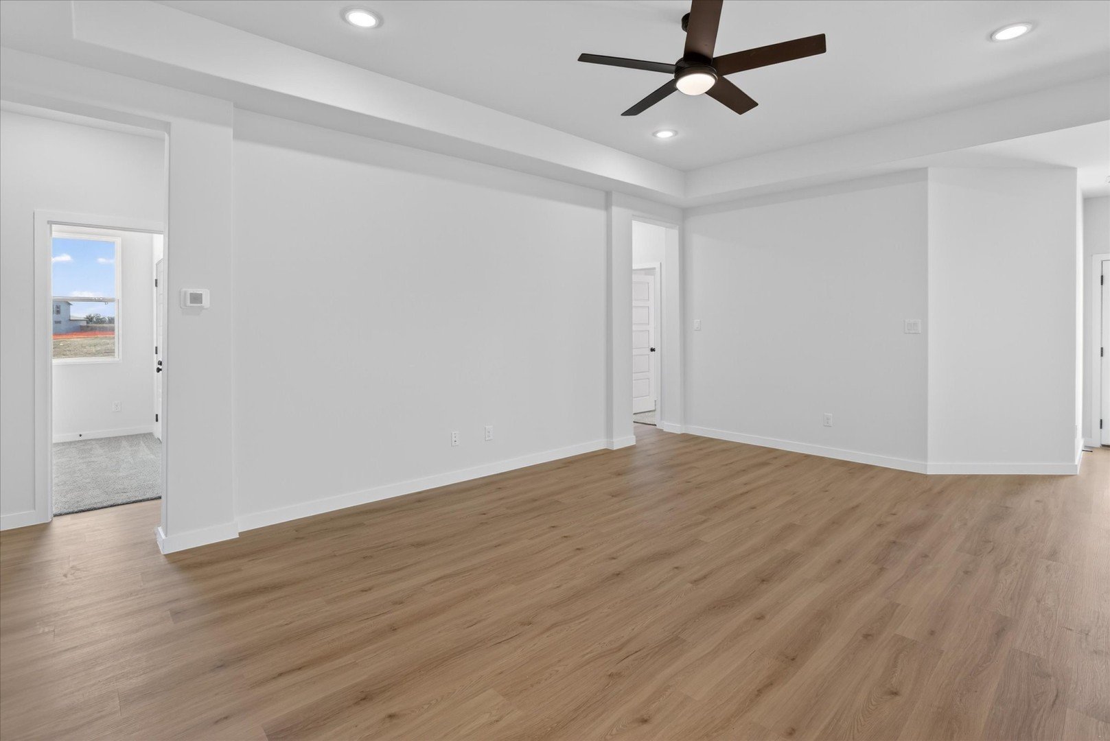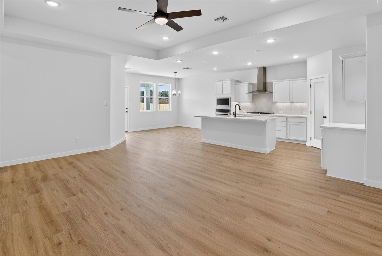 Further inside, the home opens into a bright, open-concept living area. The great room connects seamlessly to the kitchen, which features sleek countertops, a large island, abundant cabinetry, and a corner pantry for extra storage. The adjoining dining area provides a warm space for everyday meals and gatherings.