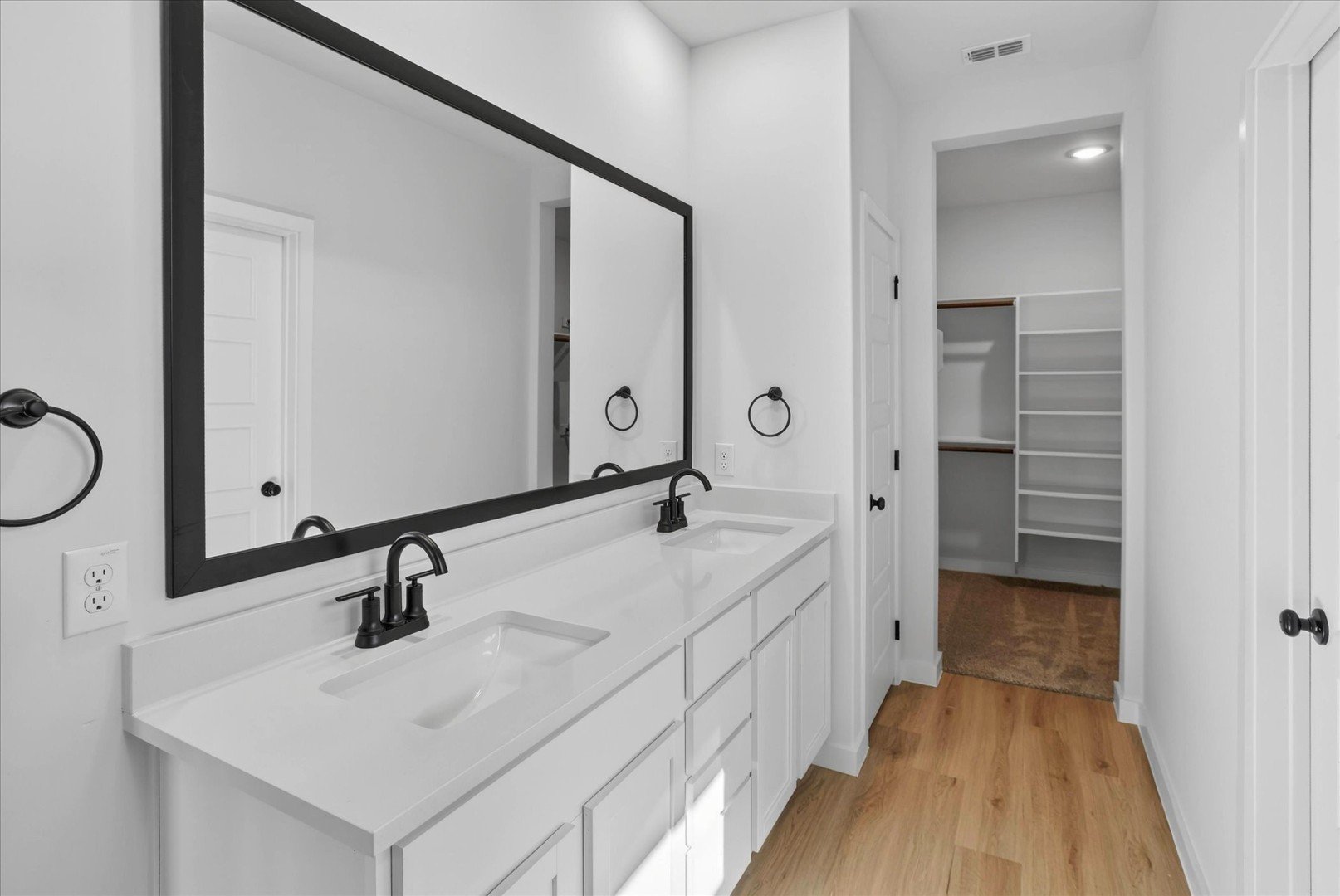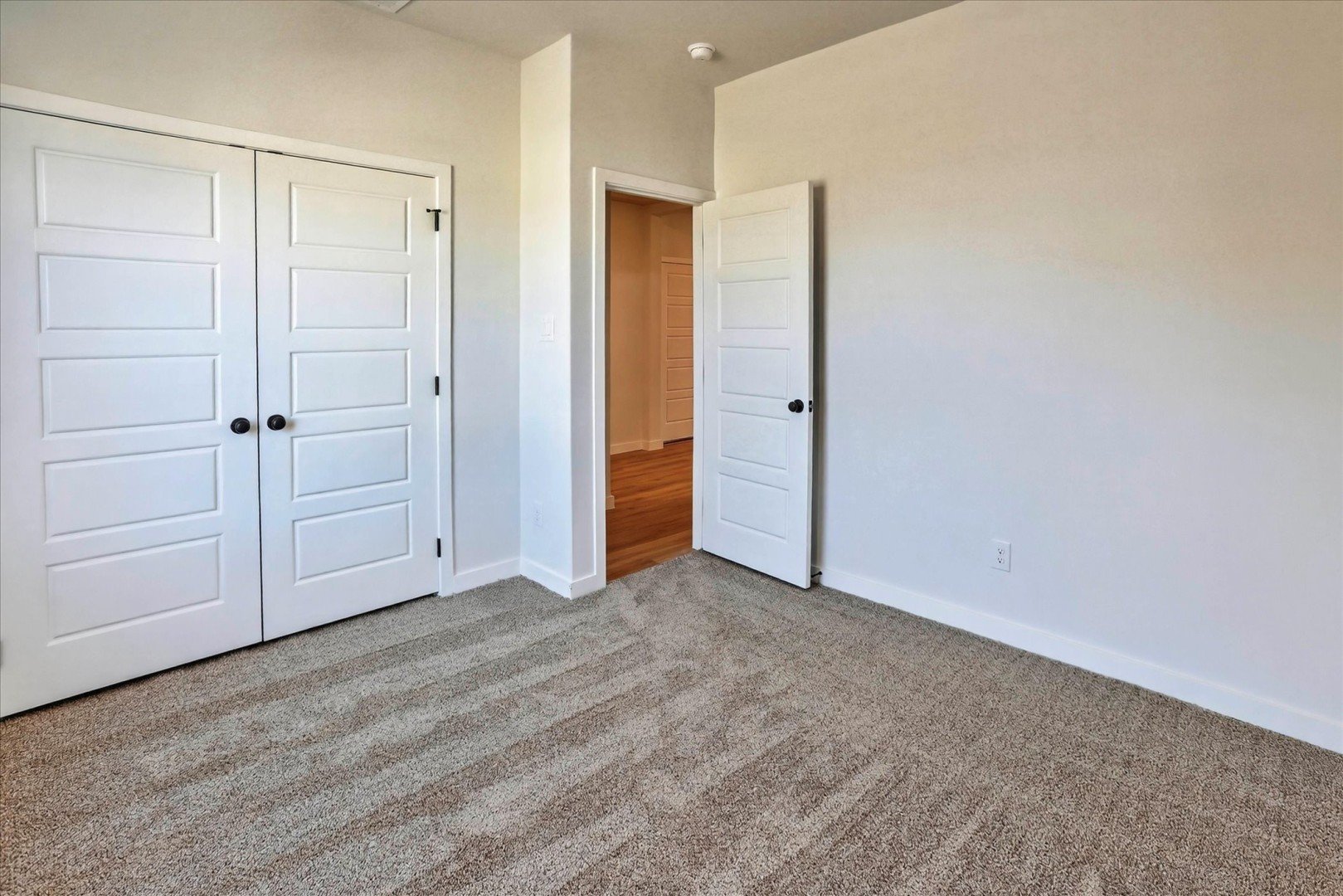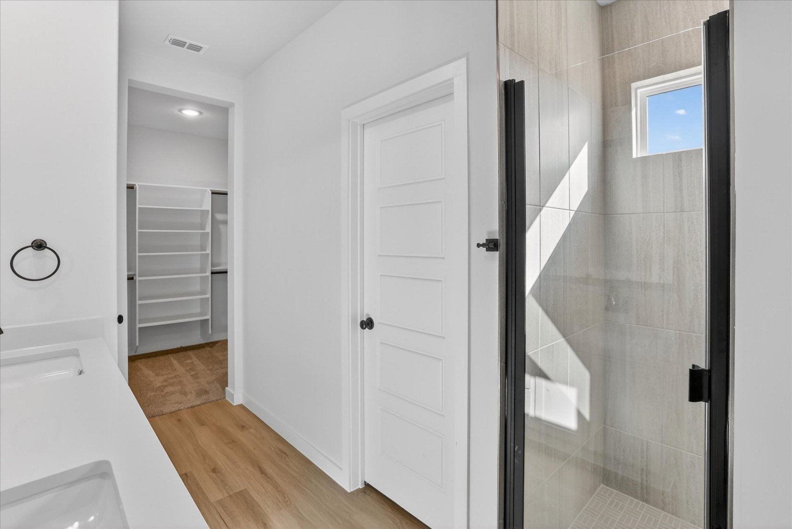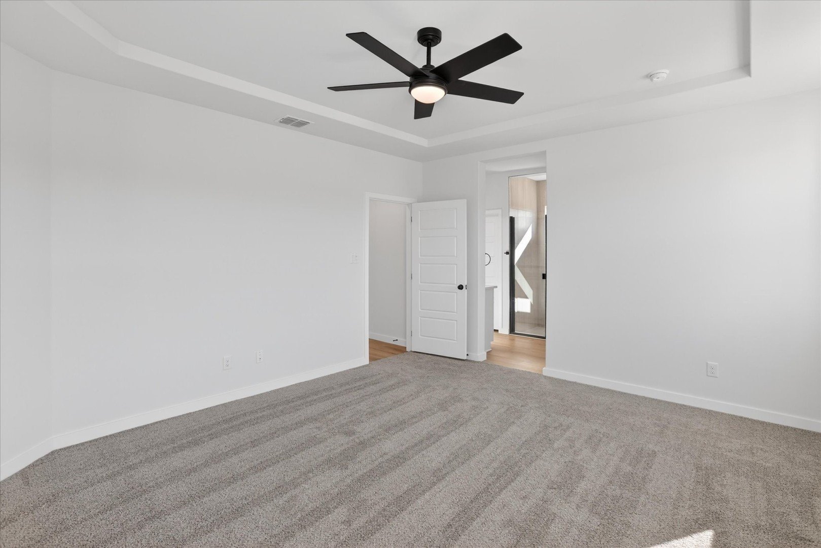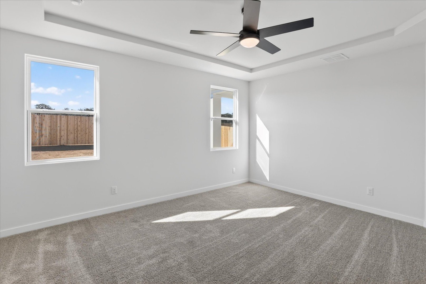 A third secondary bedroom and nearby powder room add convenience and versatility—perfect for guests, multigenerational living, or a home office. Tucked at the back of the home, the private owner’s suite includes a spa-inspired bath with dual vanities, walk-in shower, and two spacious walk-in closets.